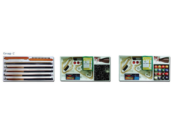 | Introduction: 1. one set of 2 1/4'' balls 2. 1pcs of wooden triangle racke 3. 1pc of wooden pool ball rack 4. 1pc of brush 5. 1pc of rail brush 6. 4pcs of cues 7. 1pc of cross stand 8. one dozen of chalk 9. 1pc of special glue 10. 10pcs of cue tips 11. 1pc of ball tray |